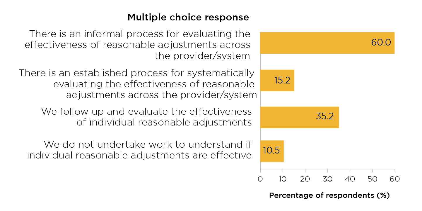 There were 60.0 per cent of respondents responded to the option: ‘There is an informal process for evaluating the effectiveness of reasonable adjustments across the provider/system’.