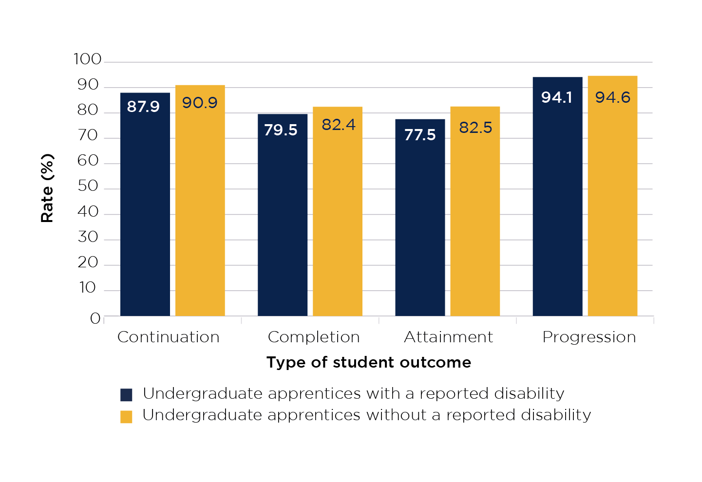 The continuation rate for degree apprentices with a reported disability is 87.9 per cent and for degree apprentices without a reported disability is 90.9 per cent.