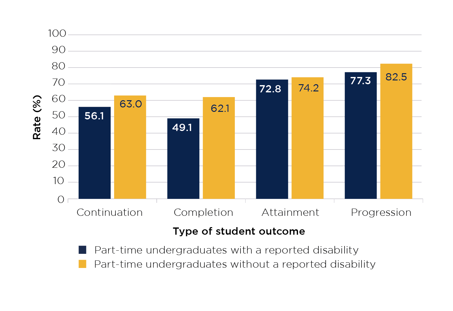 The bar chart shows the continuation, completion, attainment and progression rates for part-time undergraduates with and without a reported disability. The Y axis shows the rate as a percentage and the X axis shows the type of student outcome (continuation, completion, attainment and progression).