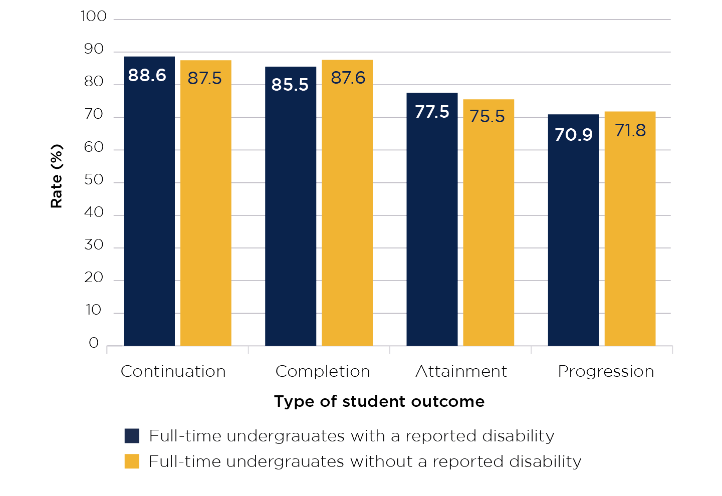 The continuation rate for full-time undergraduates with a reported disability is 88.6 per cent and for full-time undergraduates without a reported disability is 87.5 per cent.