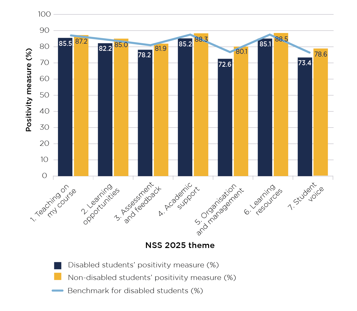 The results of the National Student Survey (NSS), the annual survey of all final year undergraduate students in the UK, consistently suggest that the experiences of disabled students fall behind those of their peers who did not declare a disability.15 While overall positivity in the 2025 NSS has mostly increased compared with 2024, in every theme the positivity measure of disabled students is lower than that of non-disabled students.16